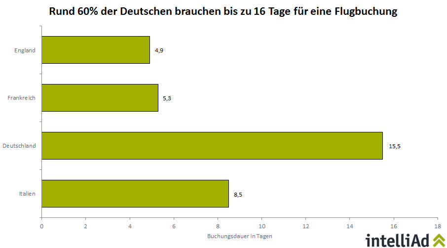 Wie lange dauert der Prozess von der Recherche bis zur Buchung eines Fluges? Eine intelliAd Datenanalyse vom Februar ist dieser Frage nachgegangen und hat ergeben, dass die Buchung eines Online-Fluges teilweise mehrere Tage dauern kann. Interessant ist hierbei, dass im Vergleich der User verschiedener europäischer Länder durchaus Unterschiede festzustellen sind. Dabei sind die Deutschen im Vergleich sogar noch am zögerlichsten.Denn ein Drittel der Deutschen, die im Internet einen Fug buchen wollen, braucht dazu über 16 Tage. Ein Drittel der Italiener braucht mehr als neun Tage und bei den Franzosen und Engländern braucht jeder dritte User mehr als fünf Tage bis zur finalen Flugbuchung.