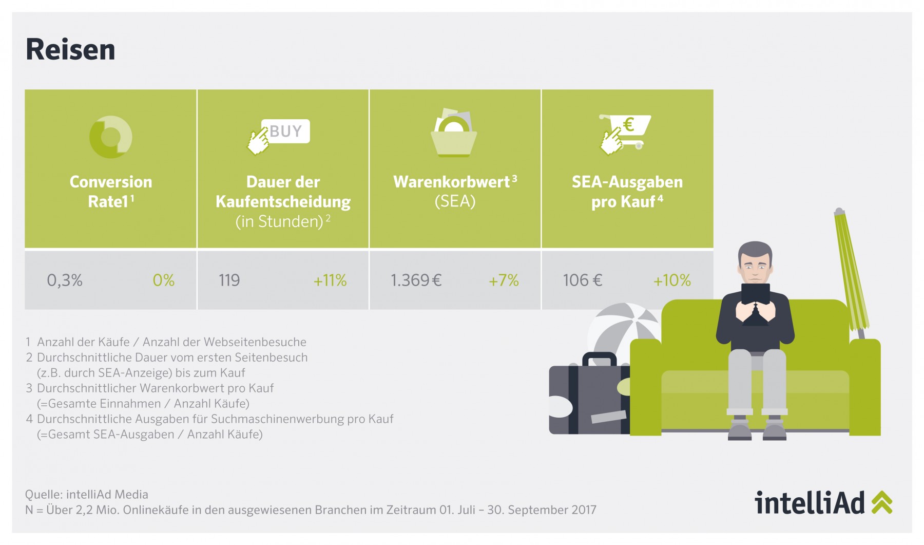 Die Online-Reiseanbieter müssen mittlerweile auch mehr Geld für Suchmaschinenwerbung (SEA) ausgeben als noch im Vorjahr. „Die SEA-Kosten pro Buchung sind im Reisebereich auf 106 Euro oder 7,7 Prozent des Warenkorbwertes gestiegen. Die durchschnittlichen Kosten pro Klick lagen bei 55 Cent“, erläutert Frank Rauchfuß, CEO von intelliAd.