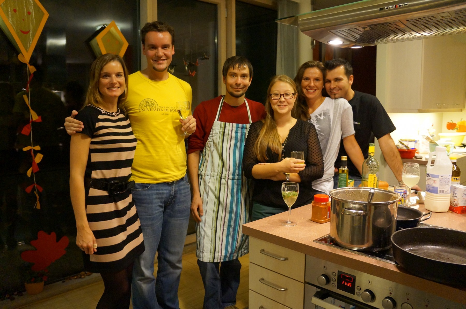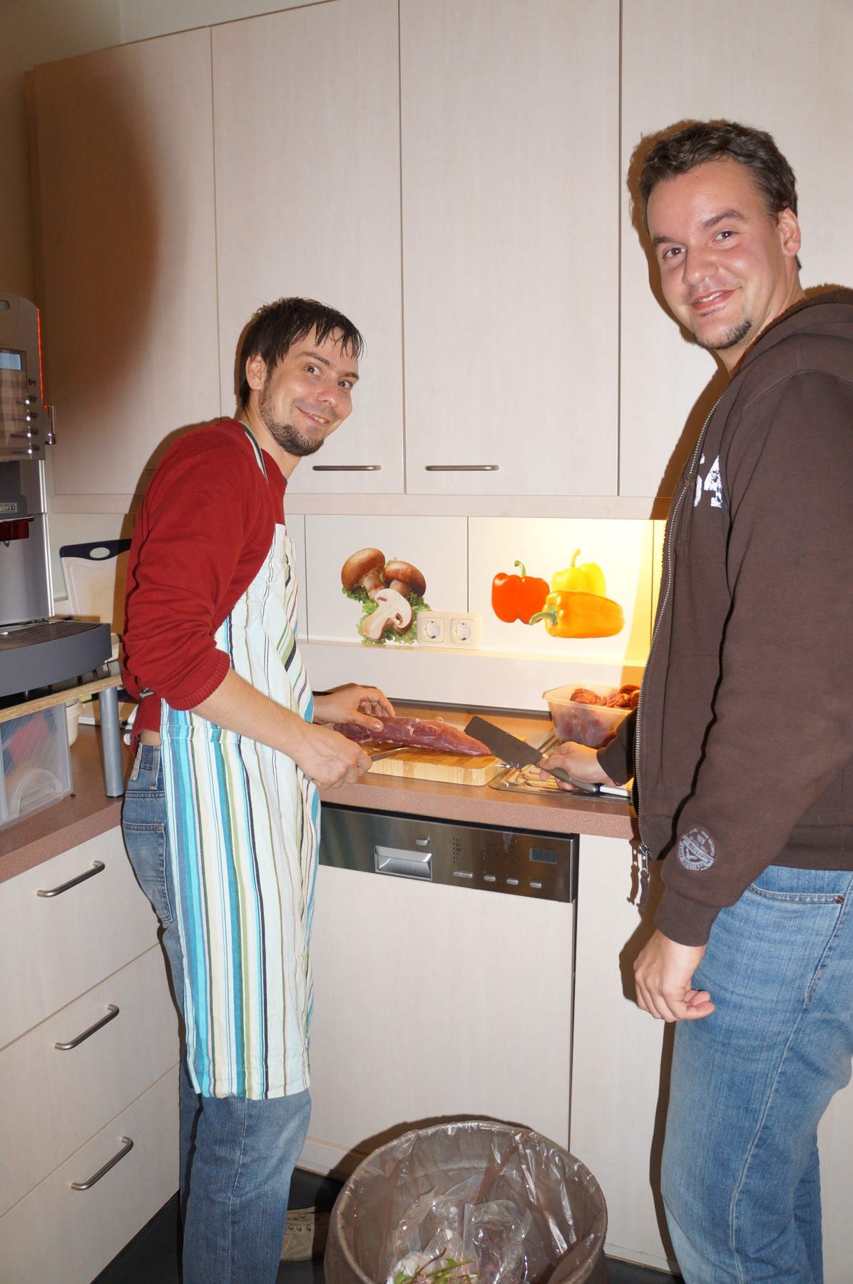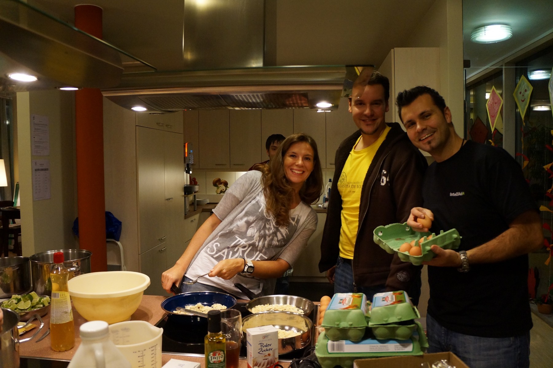 Die intelliAd Mitarbeiter erlebten bei Ihrer Ankunft in Großhadern einen warmen und herzlichen Empfang. Die offene Küche war zur Freude der Köche bestens ausgestattet, um auch für eine größere Personenzahl zu kochen. Nach und nach verwandelten sich die vielen frischen Zutaten, u.a. 80 Eier und mehrere Kilo Fleisch, in ein leckeres Herbst-Menü. Das Abendessen wurde mit einem Glas Hugo als Apéritif eingeleitet. Der erste Gang bestand aus einer getrüffelten Maronisamtsuppe, gefolgt von Schweinefilet mit selbstgemachten Spätzle in Rahmsoße. Als Dessert stand eine süße Mehlspeise auf dem Programm: Topfenpalatschinken Wiener Art. Das Thema Herbst spiegelte sich auch in der Tischdeko wider, die aus frischen Kastanien und bunten Blättern bestand.