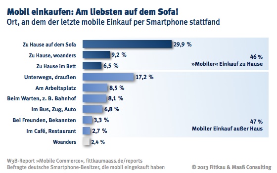 „Tendenziell wird deutlich mehr über Tablet-PCs eingekauft als über Smartphones, da diese über einen größeren Bildschirm verfügen. Allerdings sind gerade Tablet-PCs in erster Linie zuhause im Einsatz“, sagt Wolfhart Fröhlich. Selbst das Smartphone wird vor allem in den eigenen vier Wänden für den Einkauf verwendet, wie eine Studie von Fittkau und Maaß ausweist.