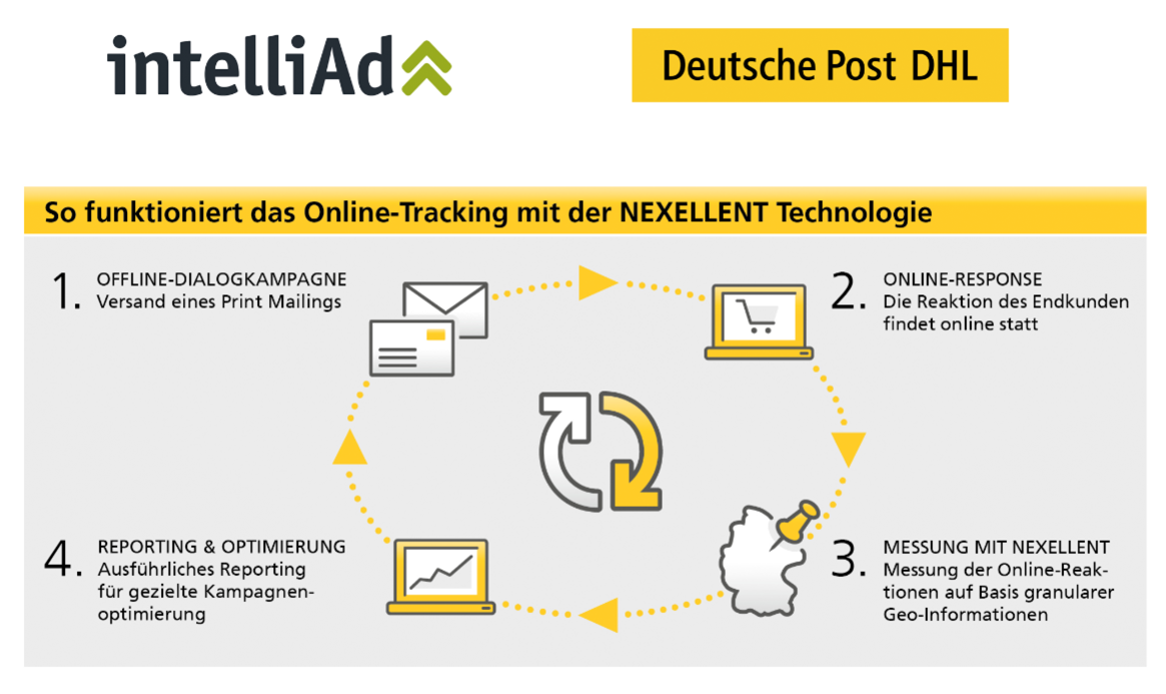 München, 10. September 2014 –Die Deutsche Post und intelliAd bündeln ihre Kompetenzen und haben gemeinsam die NEXELLENT Technologie entwickelt. Mittels dieser Technologie lässt sich künftig die Impulswirkung physischer Mailings auf die digitale Customer Journey messen. Unternehmen können ohne Response-Elemente auswerten, wie sich Werbesendungen auf Webshop-Besuche und Online-Käufe auswirken. intelliAd stellt die Lösung, die auf der 360-Grad Performace-Marketing-Plattform integriert ist, erstmals auf der dmexco 2014 vor.
