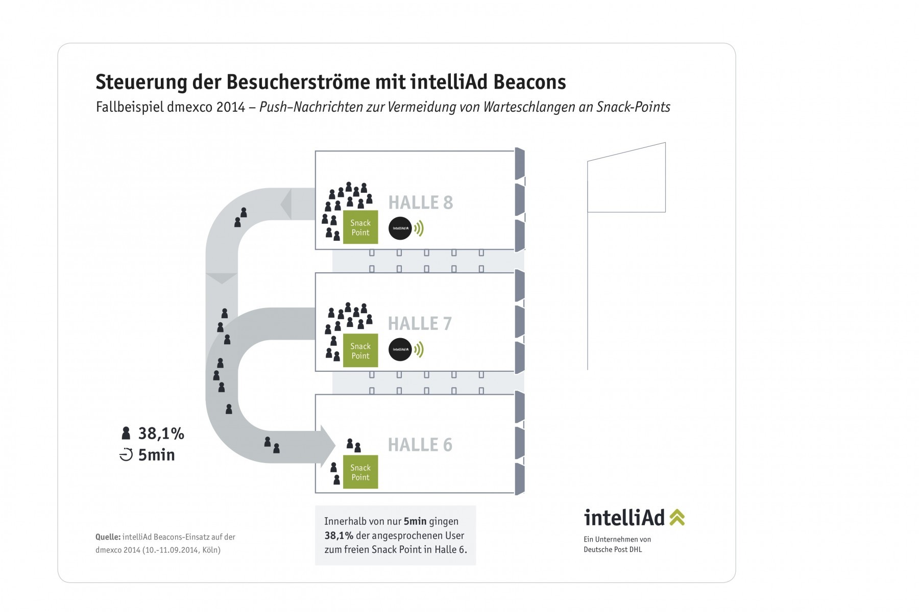 München, 18. September 2014 –Vom 10. bis 11. September war Köln verpixelt: Werbeträger der Ströer Media AG auf dem Weg zur Kölnmesse, darunter der komplette Kölner Hauptbahnhof, das Messegelände und die Hallen der dmexco, waren mit hunderten von Beacons des Technologieanbieters intelliAd Media GmbH ausgestattet. Messebesucher, die die aktuelle dmexco-App auf ihrem Smartphone installiert und die Bluetooth-Verbindung aktiviert hatten, konnten sich ortsgebundene Informationen auf ihr Smartphone schicken lassen. Der neue Service fand bei den Messegästen Anklang. 80 Prozent der dmexco-App-Nutzer konnten erfolgreich mit Push Nachrichten angesprochen werden. Der größte Beacons-Einsatz Europas bei der Messe mit über 31.000 Besuchern, war ein Gemeinschaftsprojekt der dmexco, intelliAd Media GmbH, Ströer Media AG und widjet GmbH, dem Studio für digitales Produktdesign. Mit den Mini-Sendern und dem intelliAd-Tracking ist es generell möglich, eine Verschmelzung der On- und Offline-Daten mit einer 360-Grad-Messung und Auswertung der Customer-Journey zu erhalten.