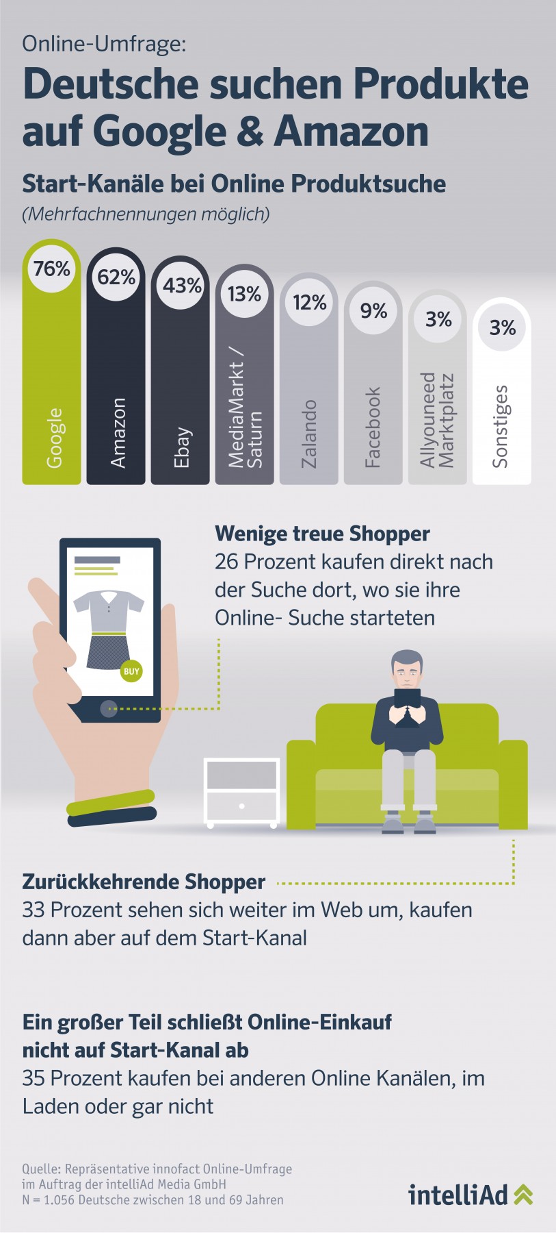 • Repräsentative Umfrage unter Online-Shoppern ergibt: Nur 26 Prozent kaufen direkt dort, wo sie ihre Produktsuche im Netz starten
